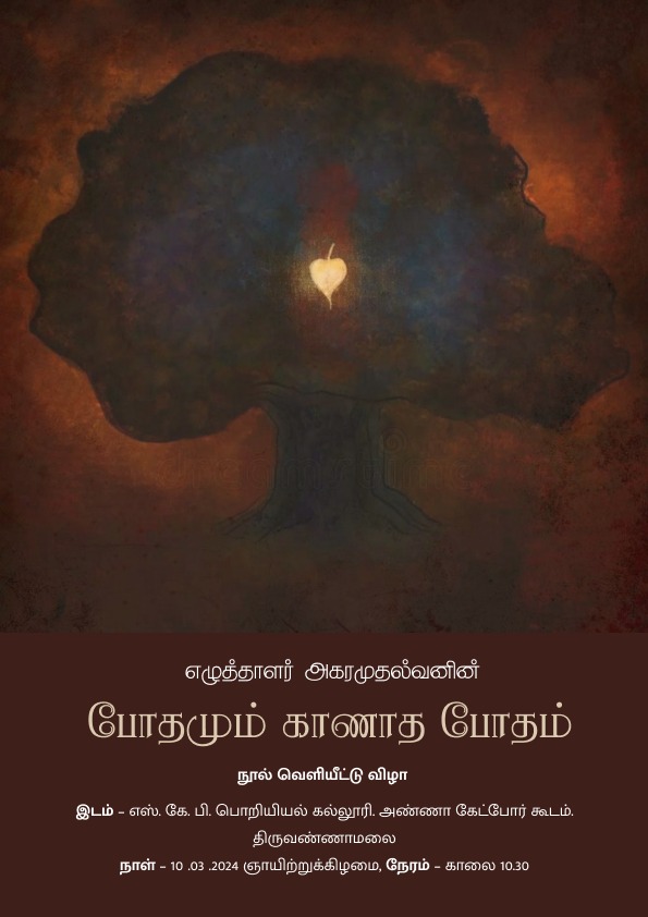 எனது “போதமும் காணாத போதம்” நூல் வெளியீட்டு விழா 10.03.2024 ஞாயிற்றுக்கிழமை காலை 10.30 மணிக்கு திருவண்ணாமலை எஸ்.கே.பி பொறியியல் கல்லூரியில் நடைபெறவுள்ளது. எழுத்தாளர் ஜெயமோகன் அவர்கள் தலைமை வகிக்கிறார். எழுத்தாளர்களான மரபின் மைந்தன் முத்தையா, கரு. ஆறுமுகத்தமிழன், செல்வேந்திரன் ஆகியோர் நூல் குறித்து சிறப்புரை வழங்குகின்றனர். சான்றோர்கள் பலர் கூடும் ஒரு நிகழ்வாக அமைந்திருக்கிறது. அனைவரையும் அன்புடன் அழைக்கிறேன்.