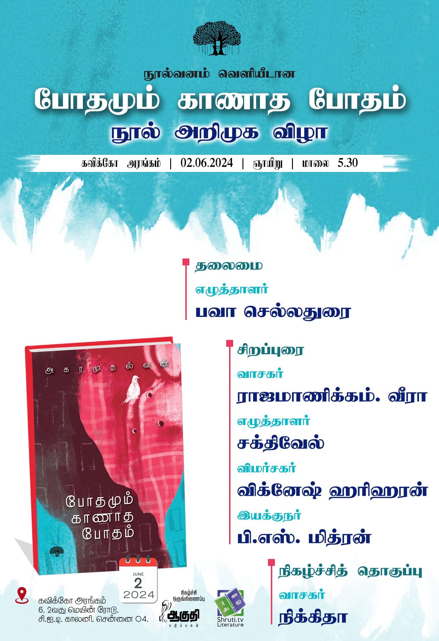 நூல்வனம் வெளியீடான போதமும் காணாத போதம் – துங்கதை நூலிற்கான அறிமுக விழா ஜூன் மாதம் இரண்டாம் திகதி ஞாயிறு மாலை, சென்னையிலுள்ள கவிக்கோ அரங்கத்தில் நடைபெறுகிறது. மரியாதைக்குரிய எழுத்தாளர் பவா செல்லதுரை அவர்களின் தலைமையில் நிகழவிருக்கும் இவ்விழாவில் திருவளர்களான ராஜமாணிக்கம். வீரா, சக்திவேல், விக்கினேஷ் ஹரிஹரன், பி.எஸ். மித்ரன் ஆகியோர் சிறப்புரை ஆற்றுகின்றனர். நிகழ்ச்சித் தொகுப்பினை நிக்கிதா அவர்கள் வழங்குகிறார். அனைவரும் கலந்து கொள்க!