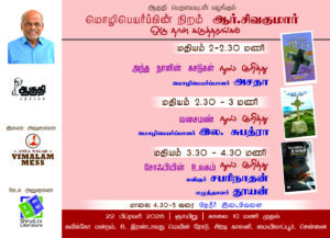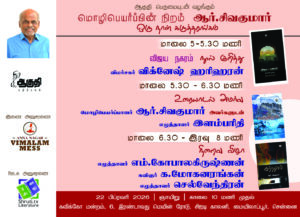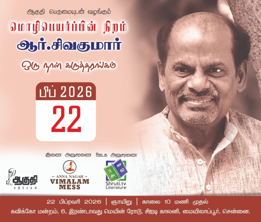 இந்த ஆண்டின் ஆகுதி ஒருநாள் கருத்தரங்கு ஆர். சிவகுமார் அவர்களின் இலக்கிய பங்களிப்பை போற்றும் வண்ணம் நடைபெறவுள்ளது. பெப்ரவரி மாதம் இருபத்தி இரண்டாம் திகதி, ஞாயிற்றுக்கிழமை கவிக்கோ அரங்கத்தில் நடைபெறும் இந்நிகழ்விற்கு உங்கள் அனைவரையும் அழைக்கிறேன். தமிழின் இளந்தலைமுறை படைப்பாளிகளும், விமர்சகர்களும், மூத்த படைப்பாளிகளும் பங்கு கொள்ளவிருக்கிறார்கள். அனைவரும் வருக!